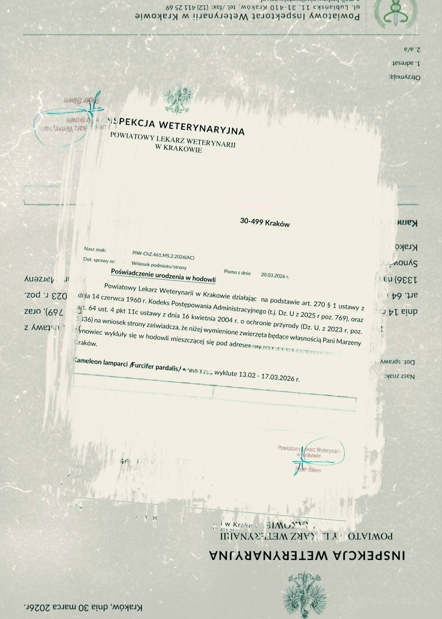 Tutaj znajdziesz wszystkie niezbędne dokumenty potwierdzające urodzenie i pochodzenie naszych kameleonów. Jesteśmy dumni z transparentności i legalności naszej hodowli, Magia kolorów.